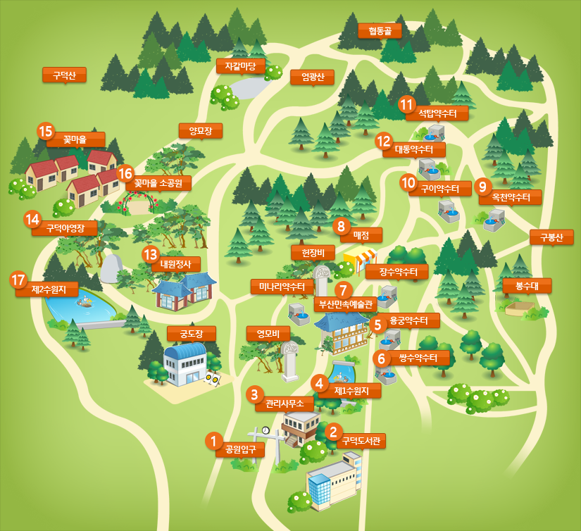 공원입구 구덕도서관 관리사무소 제1수원지 용궁약수터 쌍수약수터 부산민속예술관 매점 옥천약수터 구이약수터 석탑약수터 대동약수터 내원정사 구덕야영장 꽃마을 꽃마을소공원 제2수원지